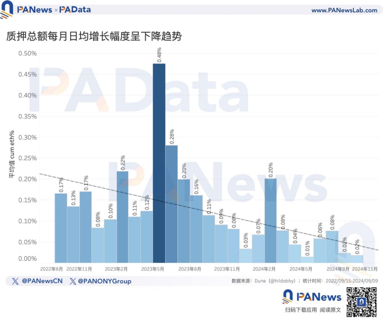 从数据反映的需求侧情况来看,目前,以太坊的质押总额为 3438.42 万 ETH,较 2 年前增长了约 150.18%,涨幅明显。但就质押额的增速来看,每月的日均增速呈现下降趋势,也即质押总额边际增长缓慢。9 月的日均增速已经下降至 0.02%,今年前 9 个月的日均增速是 0.06%,较去年全年 0.17% 日均增速下降了 0.1 个百分点以上。