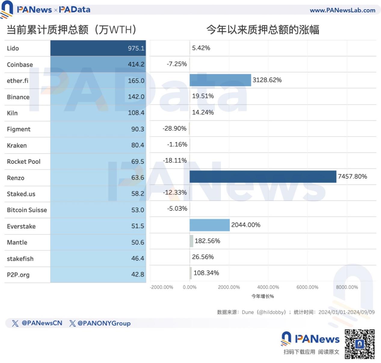 当前累计质押额最高的 3 个主体分别是 Lido、Coinbase 和 ether.fi,其中仅 Lido 的质押额就超过了 975 万 ETH。今年以来,质押额实现高速增长的主要是 Renzo、ether.fi 和 Everstake,增速分别超过了 7457%、3128% 和 2044%。
