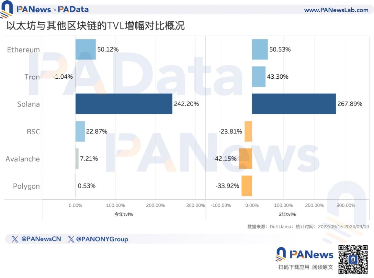 不过,当 ETH 和同期的 BTC、SOL 相比时,ETH 的表现就不尽如人意了。从这两个比值的走势来看,在以太坊正式转型以来的两年内,BTC 的表现始终好于 ETH,SOL 的表现相较于 ETH 则经历了一个先差后好的过程。