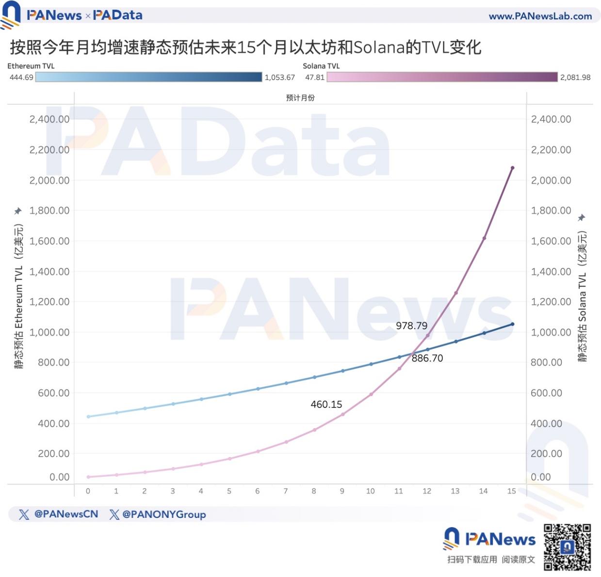 做一个简单的静态分析,如果 Solana 继续按照今年的月均增速(今年的增速 /254 天 *30 天)不变,预计再过 9 个月,其锁仓量就将达到 460 亿美元以上。如果以太坊也按照今年的月均增速不变,预计再过 12 个月,Solana 的锁仓量就将超过以太坊。竞争可能是市场开始质疑以太坊的长期期望能否实现的一个原因。