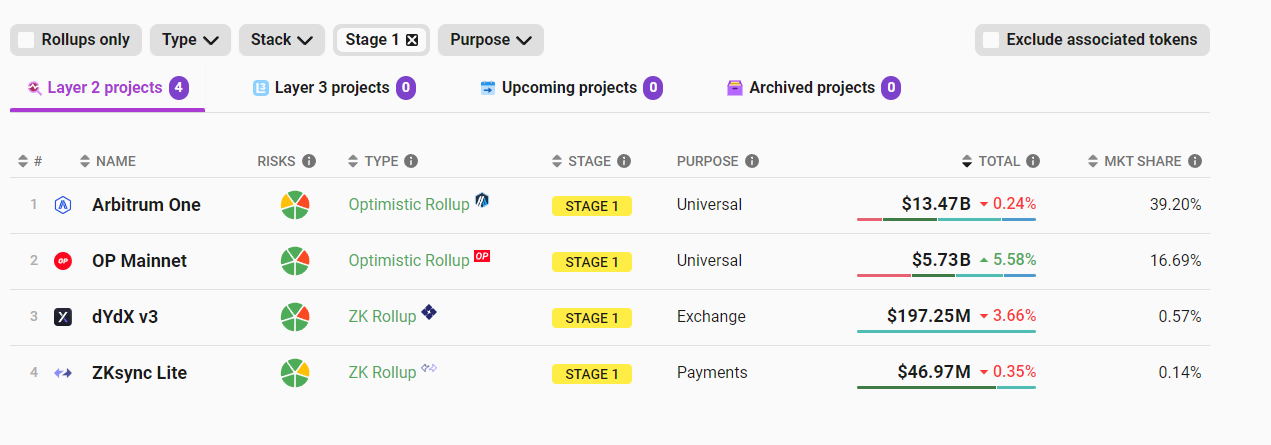 根据区块链分析平台 L2Beat 的研究,以下是声称属于第 2 层 (L2s) 且已达到第 1 阶段的网络的完整列表。此列表按总锁定价值 (TVL) 排序,持有资产最多的网络列在最前面。
