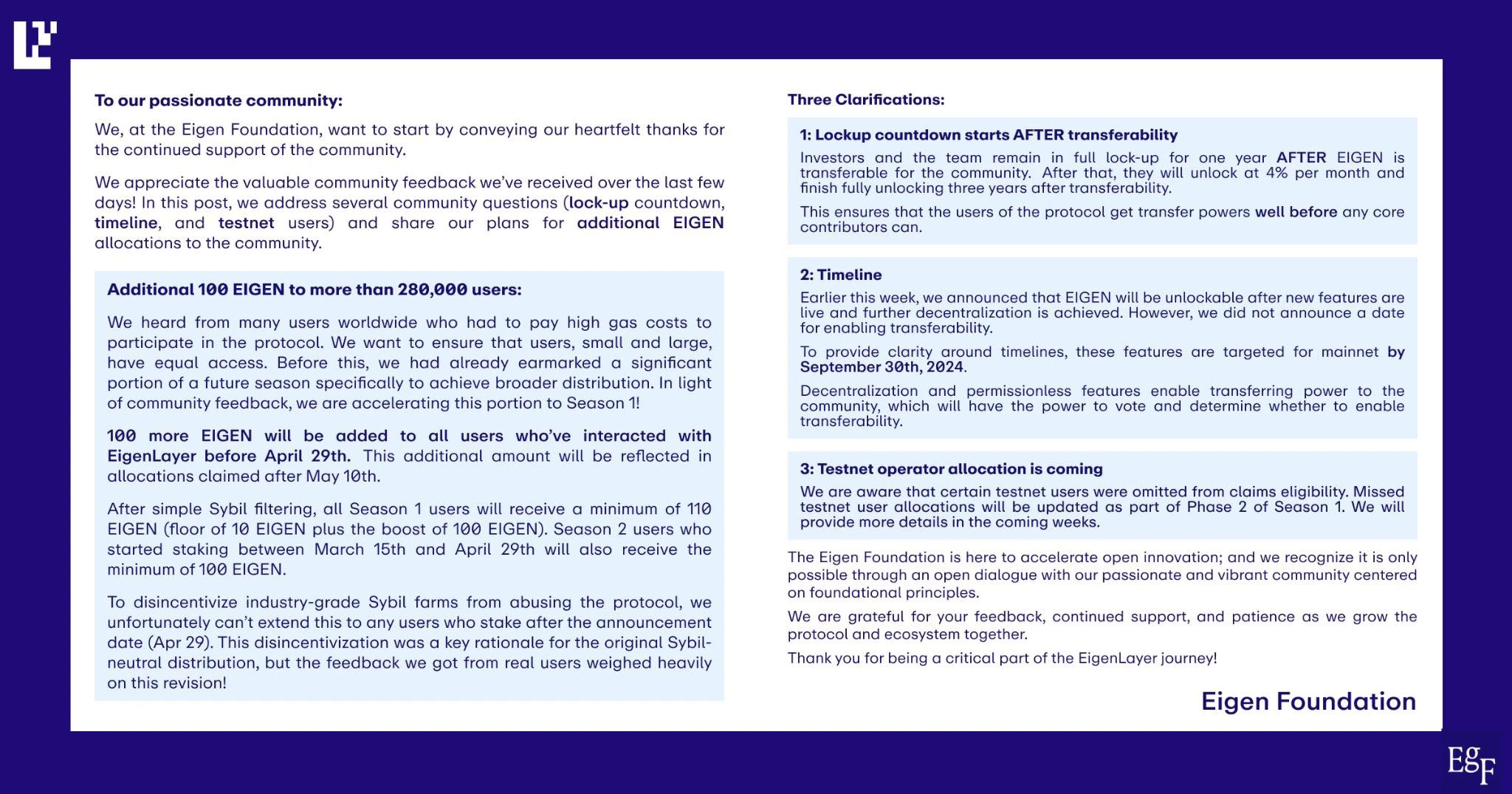 之所以传出该谬误理解,是因为 Eigen 基金会 5 月在关于解锁时间线的官方文档中提到了 9 月 30 日这个日期,但如果你细看 Eigen 基金会的描述,会发现描述其实是:「本周早些时候,我们宣布 ElGEN 将在上线新功能和进一步去中心化后解锁(after new features are live and further decentralization is achieved),但是我们并未公布具体日期,为了明确时间规划,我们计划在 2024 年 9 月 30 日之前在主网实现这些功能(these features)。」