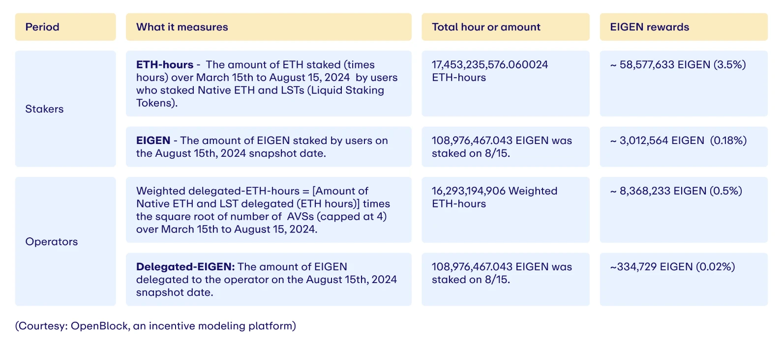 除了空投之外,另一个直接赚取 EIGEN 的方式是即将于 10 月启动的激励计划,该计划旨在以周为时间单位向表现合格的质押者及运营节点发放 EIGEN 激励。