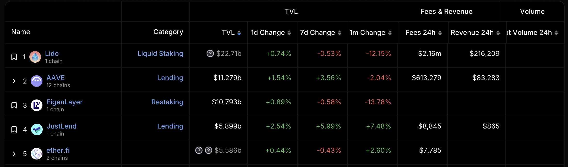 DeFillama 数据显示,EigenLayer 当前的 TVL 总值暂报 107.9 亿美元,在所有生态所有协议中排名第三,仅次于流动性质押巨头 Lido 以及借贷龙头 Aave。