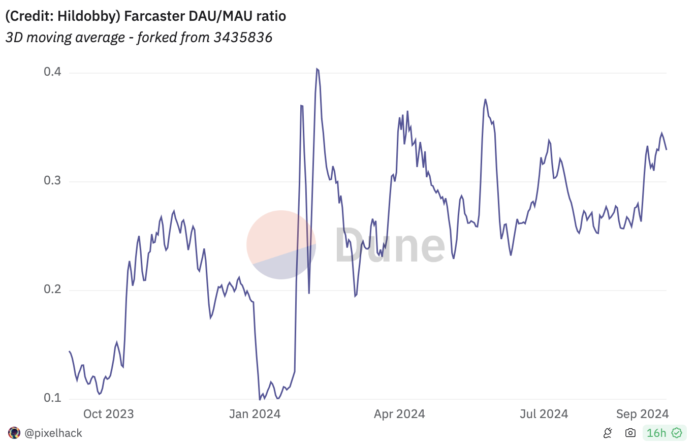 Farcaster 协议 DAU/MAU 比率,可以衡量用户粘性