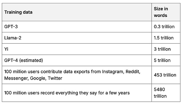 尽管开发人员无法再大规模访问这些数据,但由于数据隐私法规,个人仍然可以跨平台访问和导出自己的数据(5、6 )。平台锁定开发人员 API,而个人用户仍然可以访问自己的数据,这一事实提供了一个机会:1 亿用户是否可以导出其平台数据来创建世界上最大的数据宝库?这个数据宝库将汇总大型科技公司和其他公司收集的所有用户数据,而这些公司通常不愿意分享这些数据。这将是迄今为止最大、最全面的训练数据集,比用于训练当今领先的基础模型的数据集大 100 倍。1