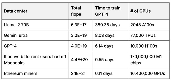与以太坊矿工 GPU 相比,对用于训练基础模型的数据中心的总浮点运算次数(每秒浮点运算次数 = 所有 GPU 的“思考”速度总和)进行估计。3带有 计算的来源。