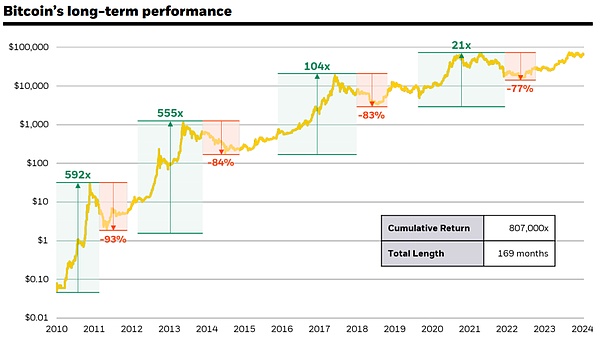在过去的10年中,比特币有7年的表现超过了所有主要资产类别,年化回报率超过100%。即便如此,比特币在其他3年里却是表现最差的资产,并且出现了四次超过50%的大幅回撤。然而,经过这些历史周期的考验,比特币展现了从大幅回撤中恢复并创下新高的能力,尽管这些周期往往伴随着长时间的熊市。