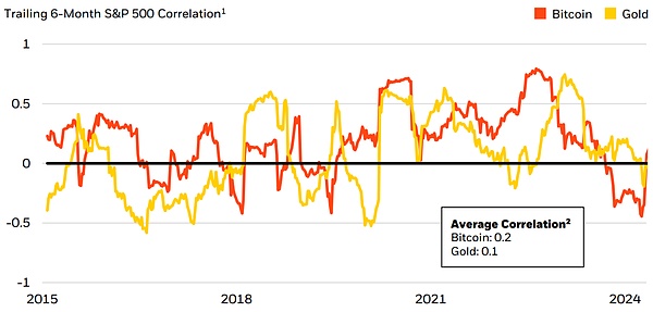 比特币作为首个去中心化、非主权的货币替代品,它没有传统的对手方风险,不依赖于任何中心化系统,也不受任何单一国家的经济状况驱动。这些特性使其在根本上与某些关键宏观风险因素(如银行系统危机、主权债务危机、货币贬值、地缘政治动荡以及其他国家特定的政治和经济风险)大体上脱离关系。