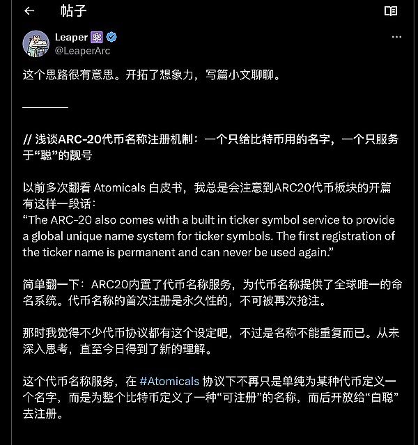 ● 揭密比特币的代币命名新玩法:ARC-20 代币名称注册机制为每个聪(Satoshi)赋予了唯一身份,创造了一个不可重名的代币命名体系。不同于传统代币命名或域名系统,它不仅服务于人,还直接标记比特币单位,使聪具备了独特的文化和历史意义,实现了「名币二象性」,即每个聪既是货币单位,也是具象化身份的标识。