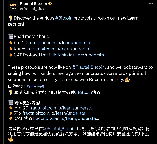 ● 探索各种 #Bitcoin 协议:brc-20, 符文, CAT20。这些协议现在已在 Fractal 上线,期待看到我们的建设者如何利用它们或创建更加优化的解决方案,以创建结合比特币安全性的实用性。