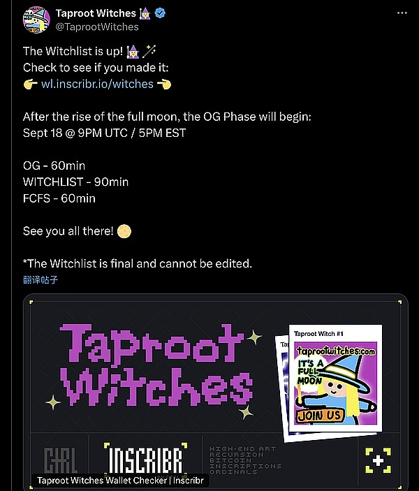 ● @TaprootWitches 女巫名单上线!检查 WL 链接。OG 阶段将开始:9 月 18 日晚上 9 点(UTC 时间)/下午 5 点(EST 时间)。OG-60 分钟,巫师名单 - 90 分钟,FCFS - 60 分钟。