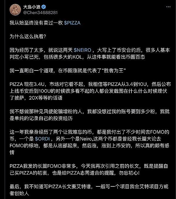 ● 始至终没有卖过一枚 $PIZZA 坚定看好 $PIZZA 的未来。尽管$PIZZA 现被市场低估,但相信未来会从 3.4U 涨到 100U。他不在乎增粉,只记录自己的投资经历,并坚信$PIZZA 是比特币社区化的 MEME 代币,提醒大家勿忘初心。(作者 @Chen34688281 写过多篇 pizza 文章)
