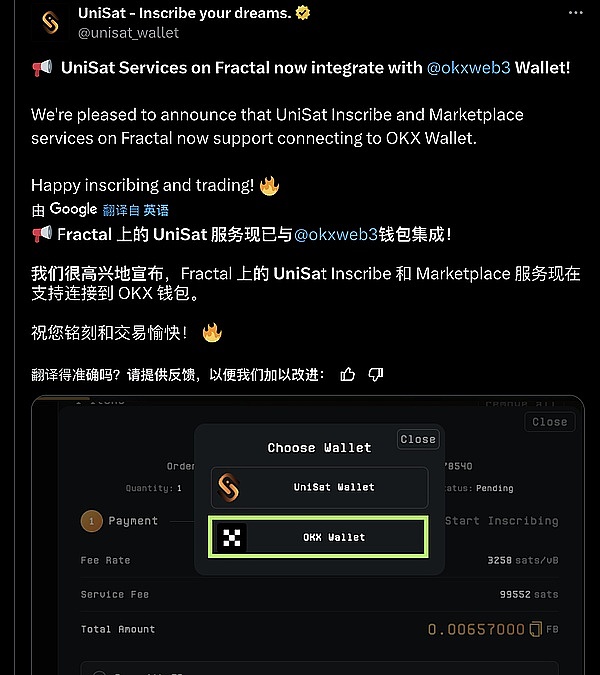 ● UniSat Fractal 网络集成 OKX:Fractal 上的 UniSat Inscribe 和 Marketplace 服务现在支持连接到 OKX 钱包。