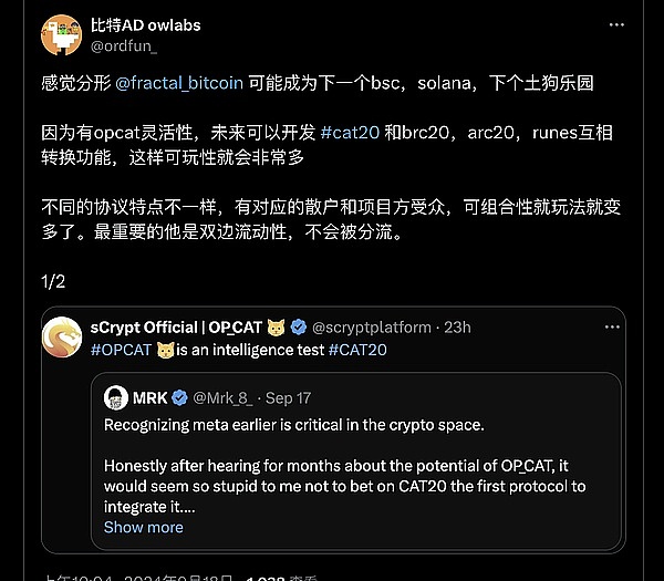 ● 关于利用主网协议的解决方案,有看法:「因为有 opcat 灵活性,未来可以开发 #cat20 和 brc20,arc20,runes 互相转换功能。帮助主网协议资产解决流动性问题,主网的用户更愿意去支持形成合力,fb 这个侧链就大有可为,能快速发展起来」