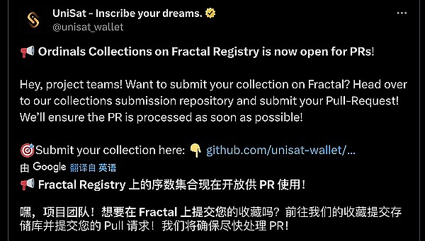 ● Fractal Registry 上的 Ordinals 集合现在开放供 PR 使用!项目方团队可以提交请求了。