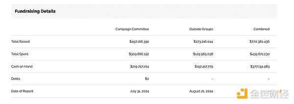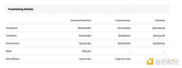 在介绍了这些背景知识后,我们来看下特朗普 2024 竞选团队与当前的哈里斯 2024 竞选团队在募资上的差距。这个差距主要体现在两个方面,资金规模以及支配效率。