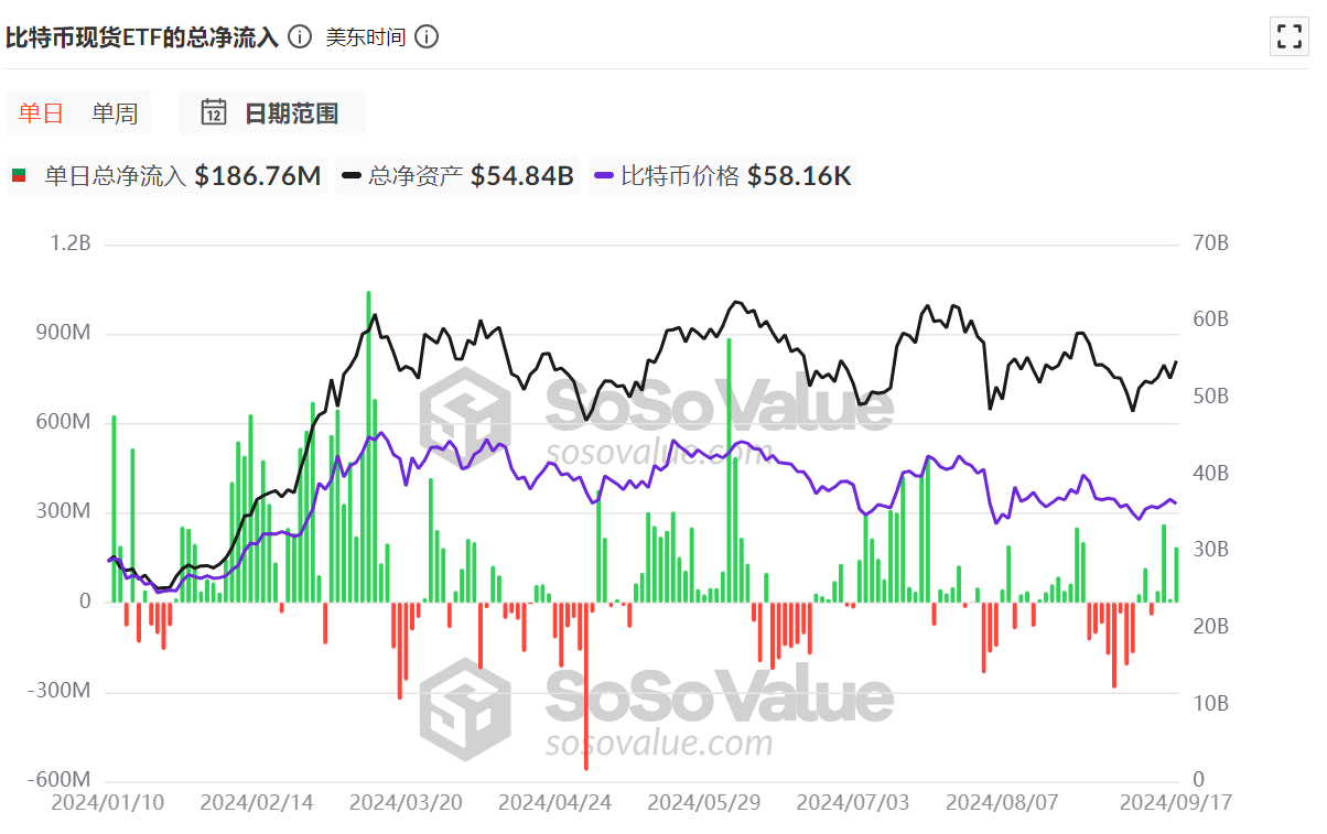 截止 9 月 17 日,比特币现货 ETF 已累计总净流入达 175 亿美元。 8 月末至 9 月初的连续 8 天净流出终结,9 月 12 日起,比特币现货 ETF 实现连续 4 天净流入。