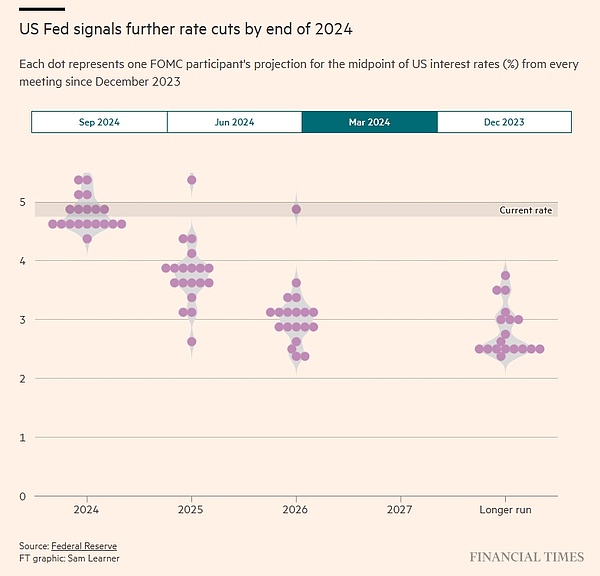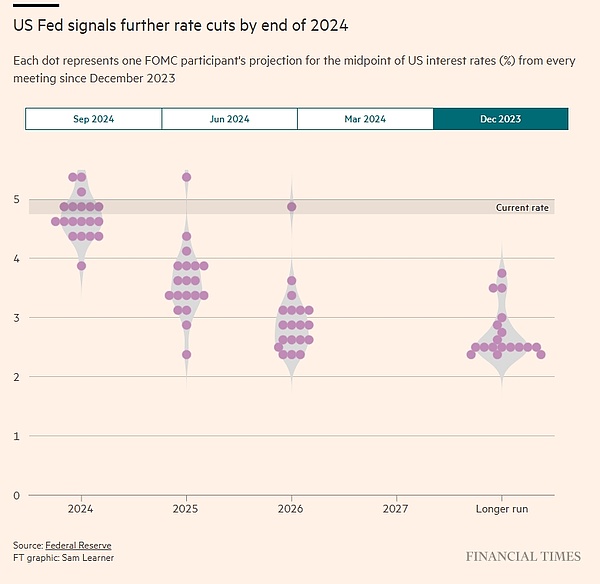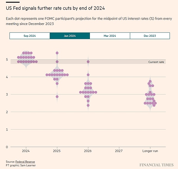 美联储官员们也明确表示他们不会止步于此,周三公布的所谓点阵图预测显示,联邦公开市场委员会(FOMC)的大多数成员估计今年政策利率将再下降半个百分点,随后在2025年进行一系列降息,将利率保持在3.25%至3.5%区间。
