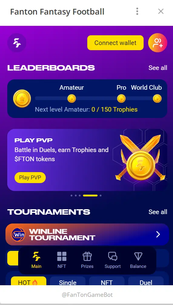 Fanton是基于Telegram的梦幻足球小游戏,玩法类似于NFT梦幻足球游戏Sorare,玩家需要先拥有体育明星NFT收藏卡作为游戏角色,然后组队参与比赛赚取奖励,目前平台支持用户使用TON或Telegram Star虚拟币支付购买。