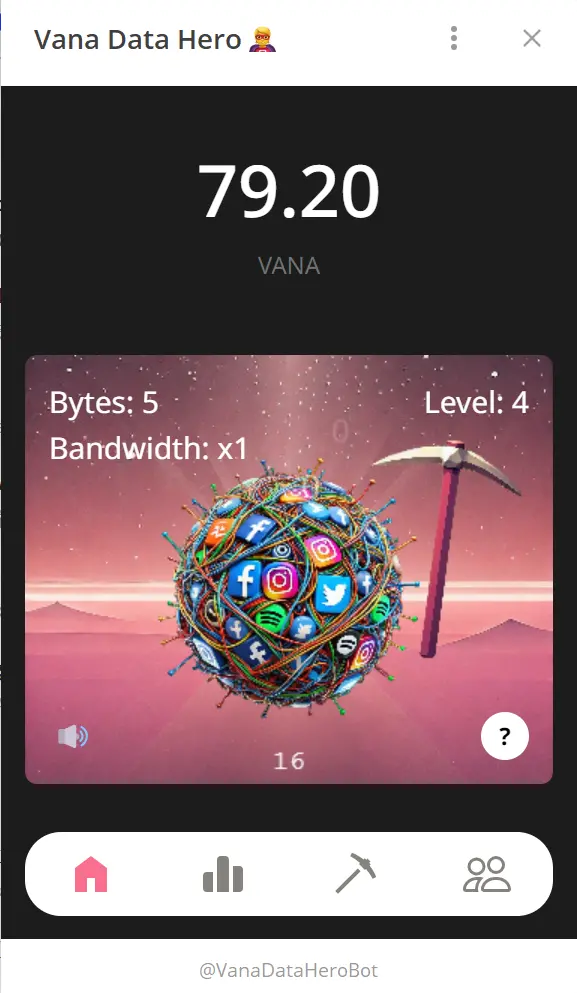 今年7月,Vana在Telegram上推出了一款名为Vana Data Hero(数据矿工)的小游戏,玩家可以通过使用斧头,点击屏幕上的圆球,就可获得VANA表示的积分,社区用户猜测未来项目方可能会根据该积分数量奖励空投。
