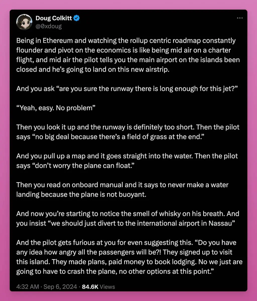 @ambient_finance 的创始人 @0xdoug 幽默地、但也准确地将以太坊以汇总为中心的计划比作一个飞行员在飞行中发现跑道太短,却仍坚持认为一切无碍——尽管所有证据都表明情况不妙。