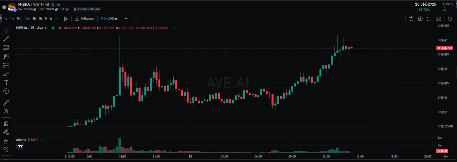 $ MISHA 一上线便掀起狂热,项目市值从起初的 1 万美元迅速飙升,在短短 4 小时内突破 1000 万美元关口,吸引了大量资金涌入。24 小时内,$ MISHA 的交易量已高达 2500 万美元,表现极为亮眼。