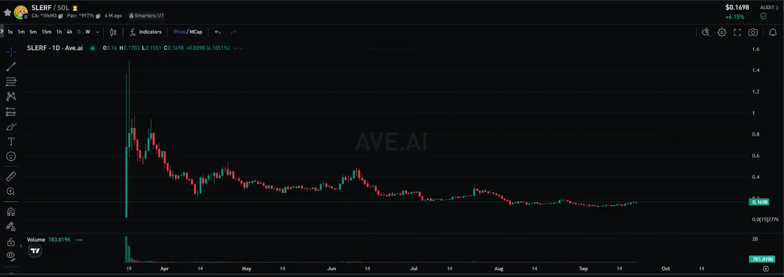 SLERF 在 HTX 、 Bitget 和 Gate 上线后,价格最高曾攀升至 1.44 美元,市值接近 7 亿美元。然而,经过长达六个多月的震荡, Slerf 的市值已较高点下跌近 90%,当前市值为 8400 万美元,价格为 0.168 美元。