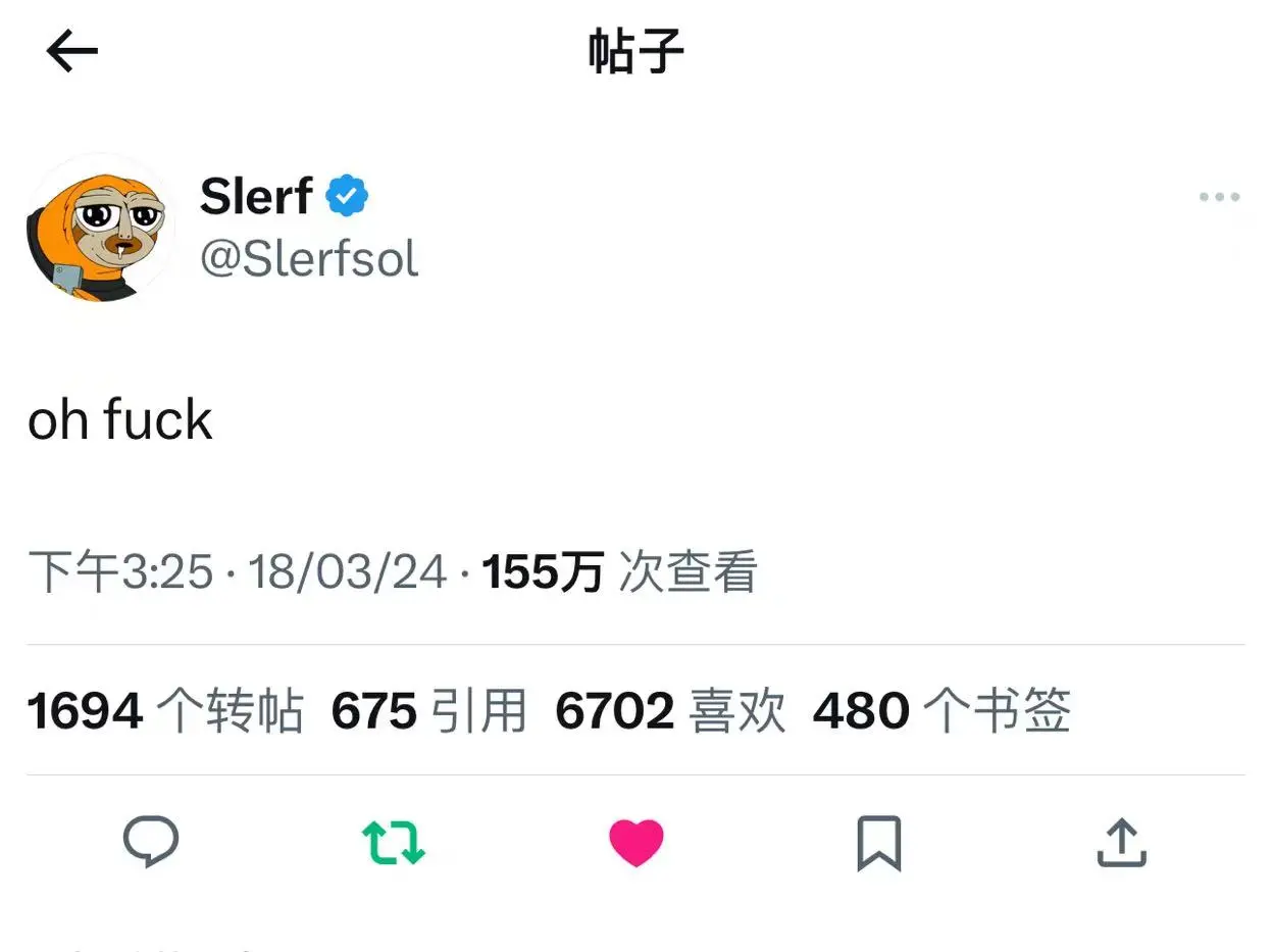 「 Oh fuck !」这句引人注目的话语,源自于 Slerf 树懒项目,已成为加密界的热门语句。