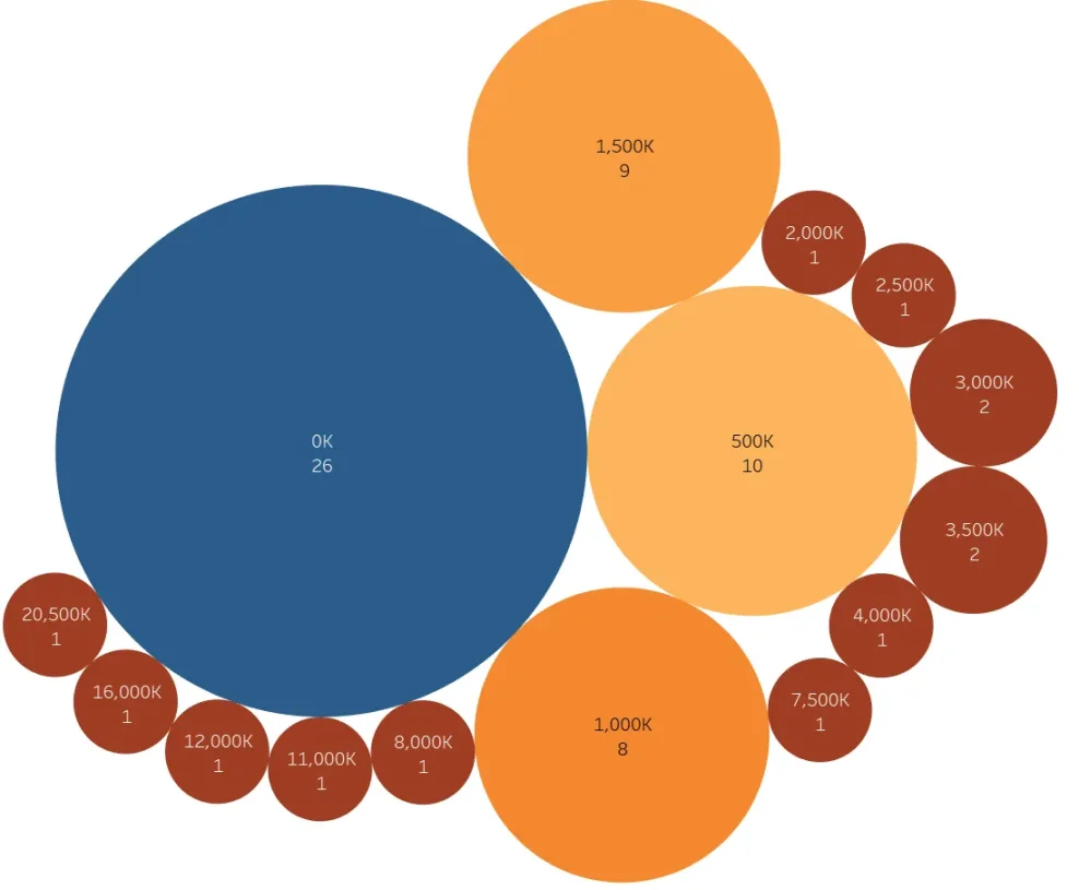 上图为近 60 天增持大户的增持情况。最大的增持量是在 0K~1K,大约在 14 万美金左右,一共有 23 个地址。其次数量为 1K~2K 的增持大户一共有 15 个。其次在 2K~12K 之间,各分布着不同的增持地址数量。但是到了 14K 以上,就比较少了,各类的增持只有 1 位。