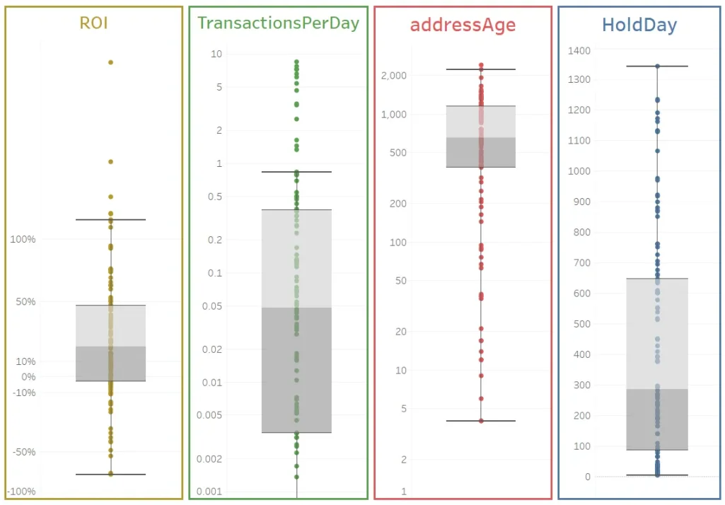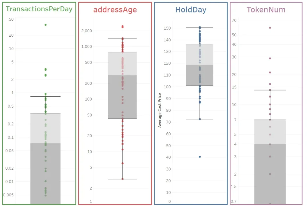 4)从 addressAge 来看,我们可以发现,中位数的钱包时间为 654 天,超过四分之三的钱包已经有 1147 天以上。这表明大部分钱包并非新生成地址,已经存在一段时间。