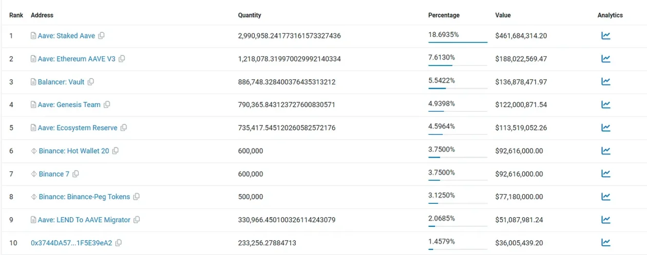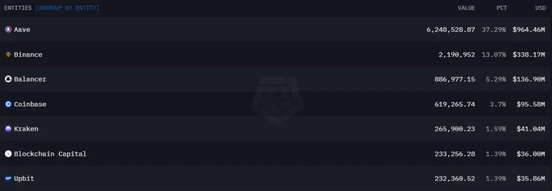 请注意,这里的持币大户在排除了项目方、DEX、CEX、MEV、DEX 中间钱包、CEX 中间钱包等地址之后,持有 AAVE 的持币大户。这些持币大户可能包含了机构。