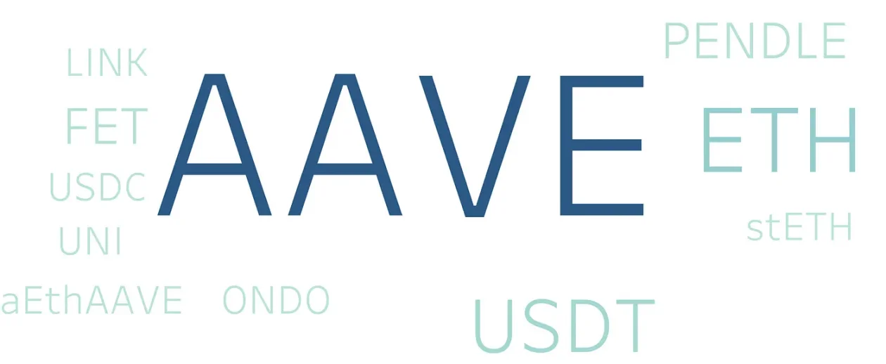 这张图可以清晰的看到,AAVE 的增持者最大的持仓是 AAVE,这当然是非常自然的答案。第二第三位分别是 ETH 和 USDT。另外的持币分布为 ONDO、USDC、UNI、FET、LINK、PENDLE、ETH、stETH、aETHAAVE、USDT。从图谱来看,增持者是比较喜欢传统的项目,而不是最新的热点和叙事。