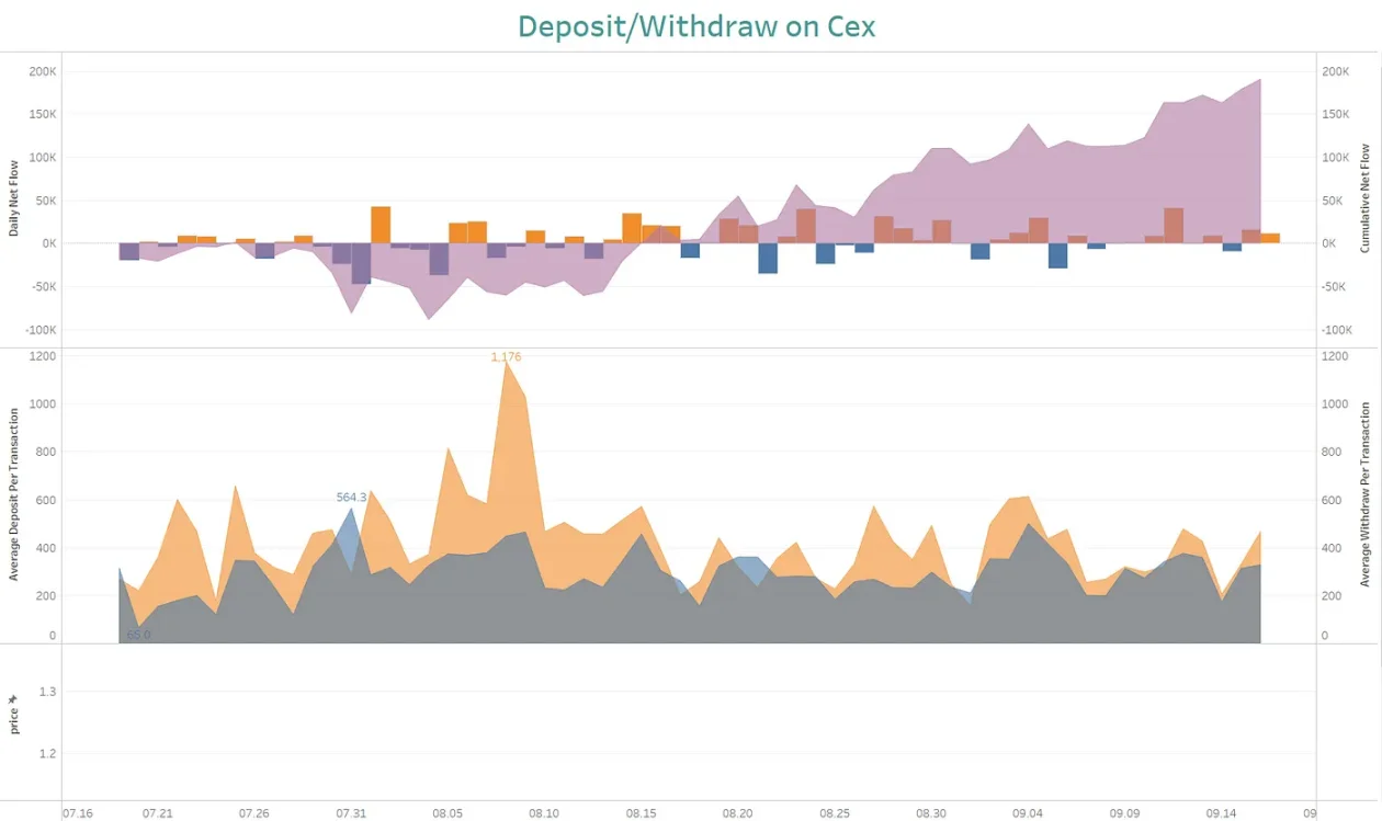 上面图中,第一张代表着每日交易所的充值 / 提现情况,其中黄色代表当日净充值,蓝色代表当日净提现。阴影面积是充值提现的累计。第二张图代表着每笔充值 / 提现的平均数量,用来判断充值和提现是否是大户行为还是散户行为。直观的看,值比较高的就是大户的行为,而峰值比较低的主要是都是散户的行为。