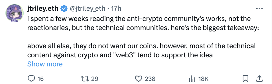1. 代币是阿喀琉斯之踵。@jtriley_eth
