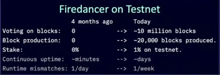 Jump Trading 的核心工程师 Liam Heeger 则分享了 Firedancer 在测试网上的进展,该客户端已成功产出超过 2 万个区块,并实现了 1% 的质押比例。