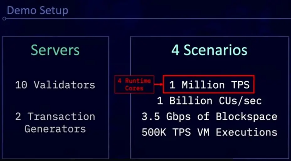 另一工程师 Aryaman Jain 的演示进一步揭示了 Firedancer 在特定条件下的表现,如在 10 个验证器环境下,其 TPS 可达百万级别,每秒处理计算单元超过 12 亿次,同时展现出 3.5 Gbps 的 Blockspace 能力和 50 万 TPS 的 VM 执行效率。