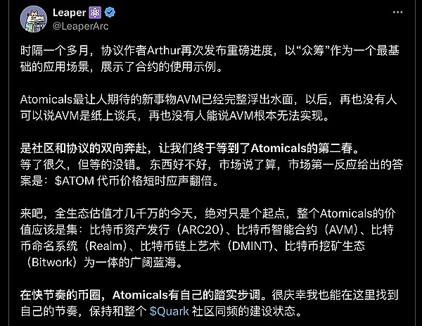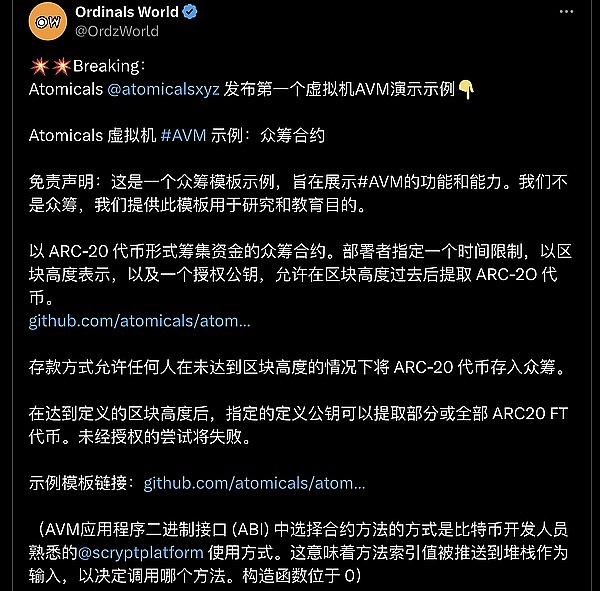 众筹合约允许以 ARC-20 代币形式筹集资金,部署者设置区块高度和授权公钥,以便在达到高度后提取代币。任何人在区块高度未达到之前都可以存入 ARC-20 代币,而达到高度后,指定公钥才能提取部分或全部代币,未经授权的提取将失败。(公告一出 $atomarc 暴涨近 3 倍,最高触及 2.6u,目前稳定在 1.7u 附近)