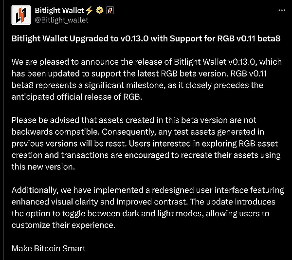 支持 RGB v0.11 beta8,Bitlight Wallet v0.13.0 已更新以支持最新的 RGB 测试版。RGB v0.11 beta8 代表了一个重要的里程碑,因为它紧随 RGB 的预期正式发布之前。