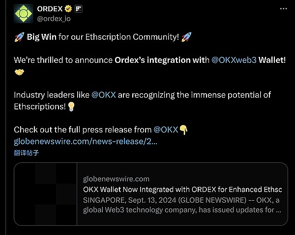 ● Ethscriptions 宣布 Ordex 与 @OKXweb3 钱包整合!$eths 大涨 40%,目前 1.2u 附近。