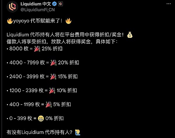 Liquidium Token 持有人将在平台费用中获得折扣/奖金。借款人将享受折扣,放款人将获得奖金。规则