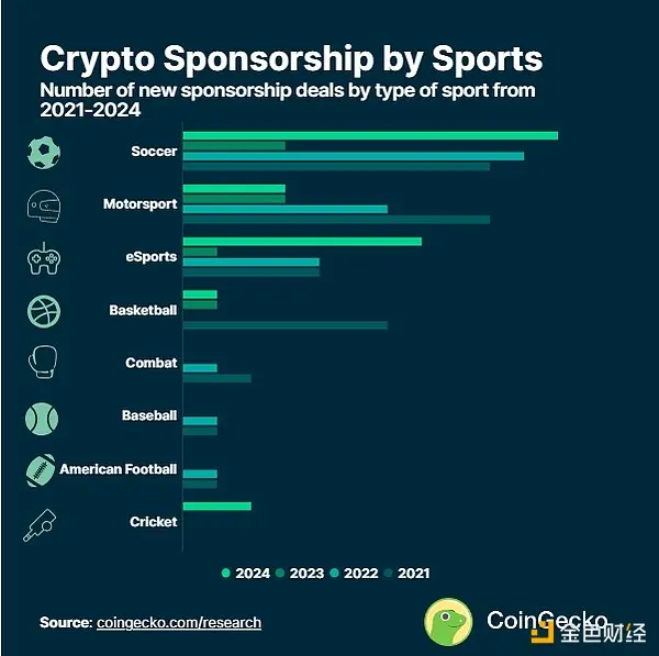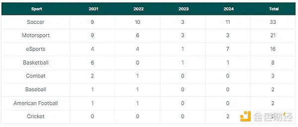 2021 年至 2024 年期间按加密货币赞助数量排名的体育项目如下: