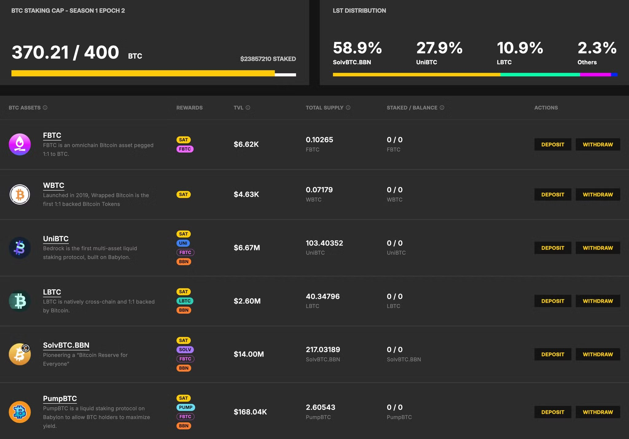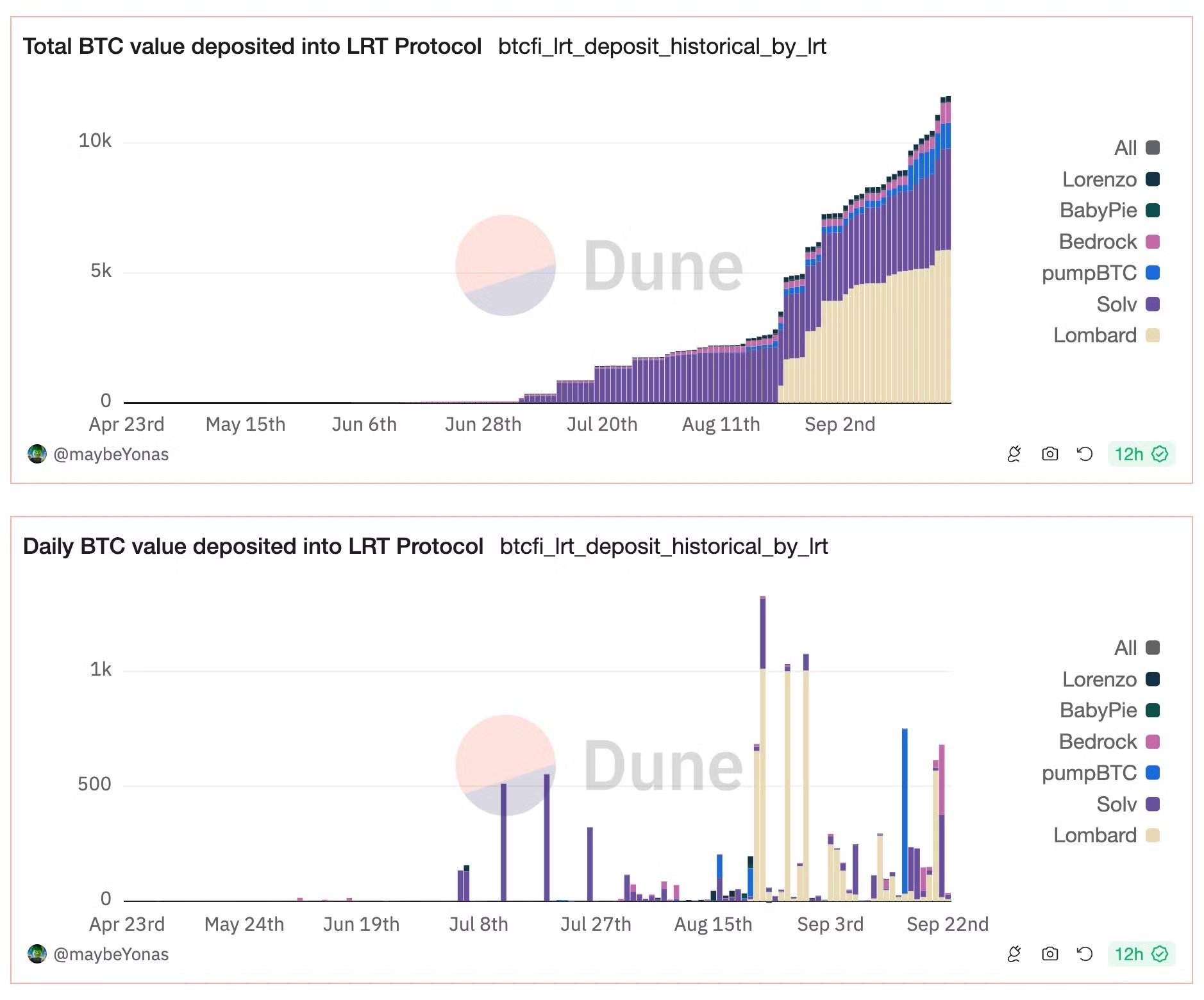 在 Babylon Stage 1 迅速达到 1000 BTC 上限后,BTC LST 之间的竞争持续升温,各方都在争夺 BTC 及其封装资产的质押生息入口。在过去 30 天中,@Lombard_Finance 实现了快速增长,以 5.9k BTC 的存款量达到目前最高 TVL,超越了原本长期处于龙头地位的 @SolvProtocol。