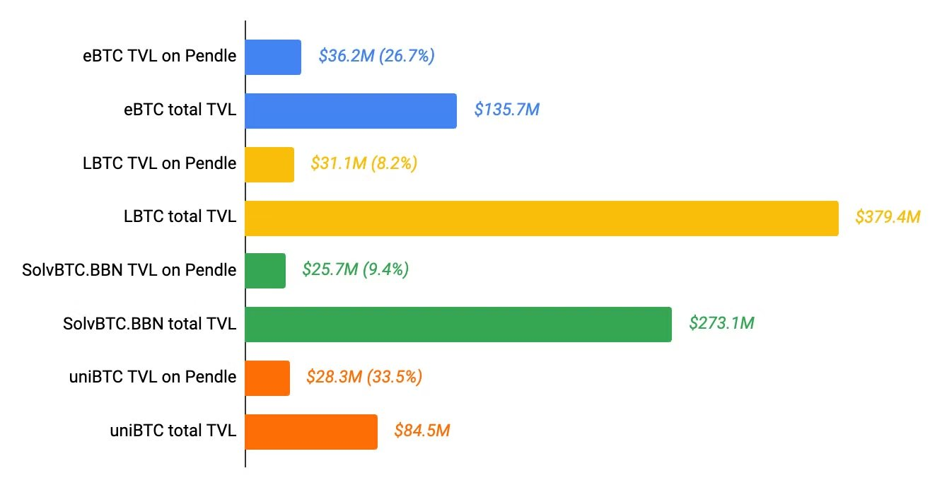 近期,Pendle 已陆续将四种 BTC LST 集成到其积分市场中,包括 $LBTC、$eBTC、$uniBTC 和 $SolvBTC.BBN。当前各 LST 在 Pendle 上的流动性和总 TVL 情况如图所示。其中,$LBTC 的实际采用情况高于 LBTC (Corn) 池中的表面数值。由于 37% 的 $eBTC 由 $LBTC 支持,Pendle 对 $eBTC 的集成也会让 Lombard 间接受益,从而使 $LBTC 持有者拥有更多优化收益策略的机会。