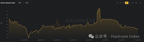 8月期间,美元本位月度平均算力价格为$43.54/PH/s/日,月初为$45.47/PH/s/日,月底降至$42.19/PH/s/日。此次下跌主要由现货比特币价格下跌、网络难度创历史新高和低交易手续费环境共同影响。币本位月度平均算力价格为0.0007246个比特币,月初为0.0007090个比特币,月底小幅升至0.0007141个比特币。