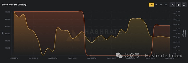 比特币价格与网络难度(2024年7月30日至2024年8月31日)