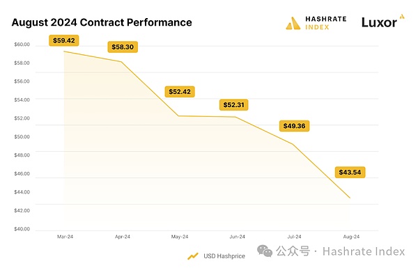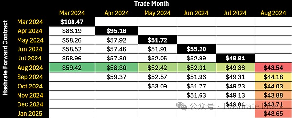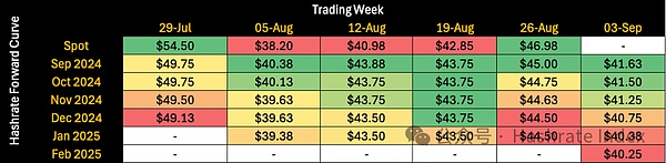 通过观察每一列数值,我们可以看到8月期间的算力远期合约价格曲线以及市场对未来价格的预期。8月初到月中,市场反应为升水交易,但在月末转为贴水,市场认为Babylon Protocol引发的交易费用激增,缺乏持久力。实际上,不同月份的算力远期合约价格均在8月初触底,而在月底有所回升。