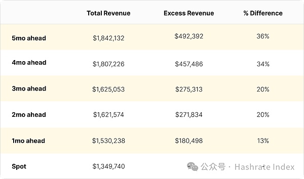 在收入影响方面,下图展示出拥有1 EH算力的矿工卖出8月算力远期合约与当月卖出算力现货的收入表现差异。