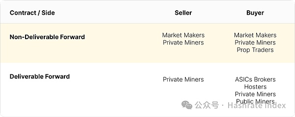 8月算力远期合约的交易方是由多样化的市场参与者组成。可交付算力远期合约交付式(DF)和不可交付算力远期合约(NDF)的主要参与者是矿工、贷款机构和做市商。矿工出售NDF以对冲风险敞口,出售DF用于融资升级新一代矿机。
