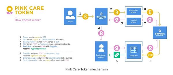 后来,我们还在 Binance Smart Chain(现 BNB chain)上发行了全球第一个(可能也是至今唯一一个)“价值稳定币”:粉红币(Pink Care Token),和其他稳定币不同的是,粉红币不和任何法币“价格”挂钩,而是以物品价值挂钩:每一枚粉红币,与一个女孩在乌干达使用一年的卫生巾的“价值”挂钩。这个项目的起源,是因为在当地发土豆白菜的时候,和当地人聊天,发现“月经羞耻”仍广泛存在在当地女性群体,由于平时缺乏性教育,也由于卫生巾价格昂贵难以购入,经期用树叶草皮取代卫生巾,造成严重妇科问题,而很多女孩 14 岁就要结婚生子,过早的怀孕又雪上加霜,直接造成很多女孩在生育中死于感染。拿到粉红币的女孩,都可以去和我们合作的环保卫生巾供应商那里“兑换”一年的卫生巾。
